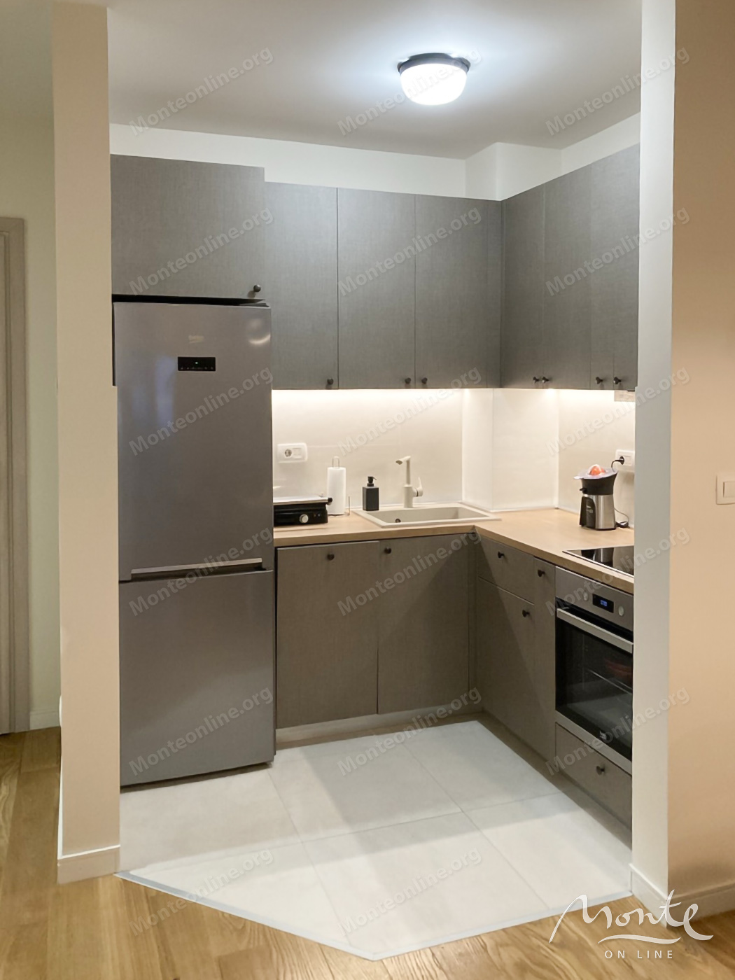 Квартира выполнена с качественной отделкой и продается в полностью готовом виде. Кухня и встроенные шкафы изготовлены компанией DODING, известной высоким уровнем материалов и исполнения. Планировка включает светлую гостиную, объединенную с кухней и обеденной зоной, отдельную спальню и современную ванную комнату.