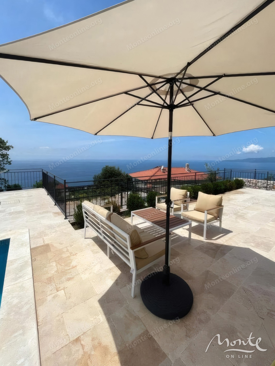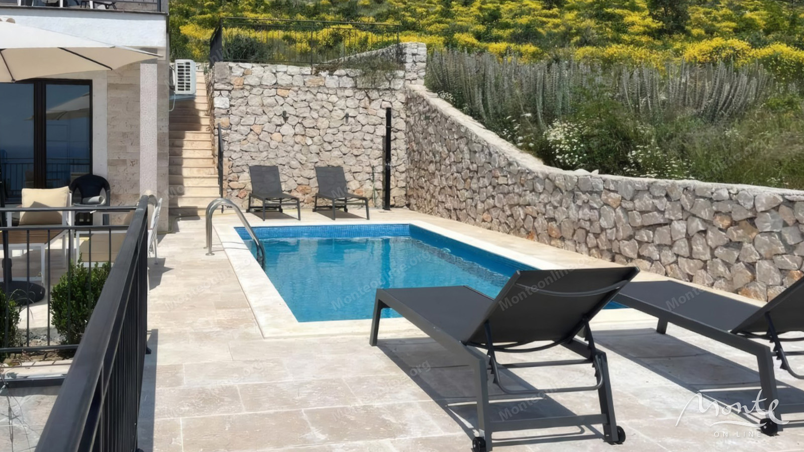 Во дворе расположен элегантный бассейн, окруженный зоной отдыха, идеально подходящий для летнего отдыха с потрясающим видом. Перед виллой находятся 4 парковочных места и гараж.