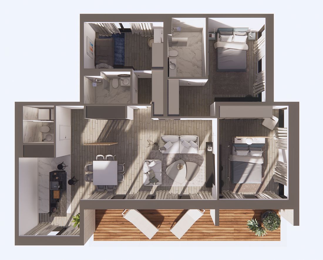 Три здания комплекса — квартира находится в среднем блоке, что обеспечивает дополнительную тишину и уединение.