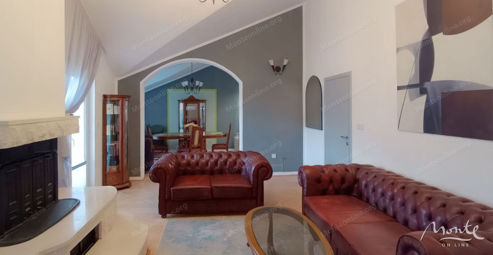 Сердце квартиры — гостиная с камином, создающим особую атмосферу тепла и уюта. Камин эффективно обогревает помещение в зимний период, а его внешняя часть выведена на террасу, что позволяет готовить на живом огне и проводить вечера с видом на море.