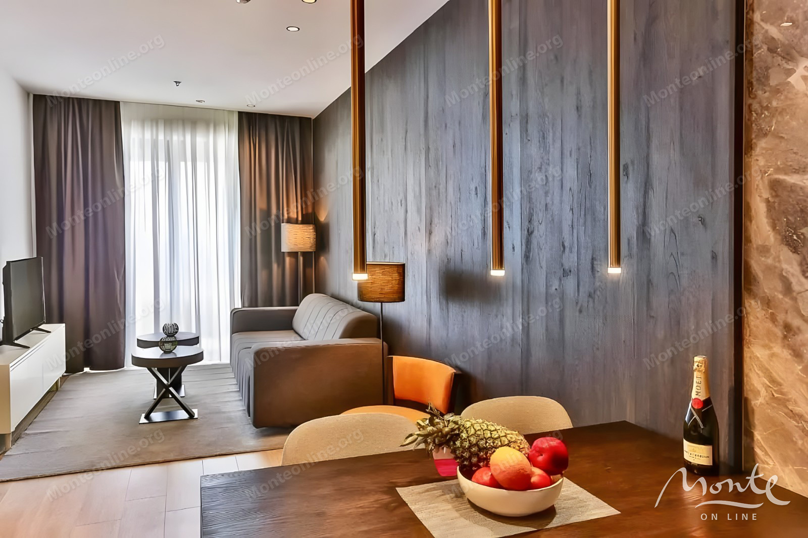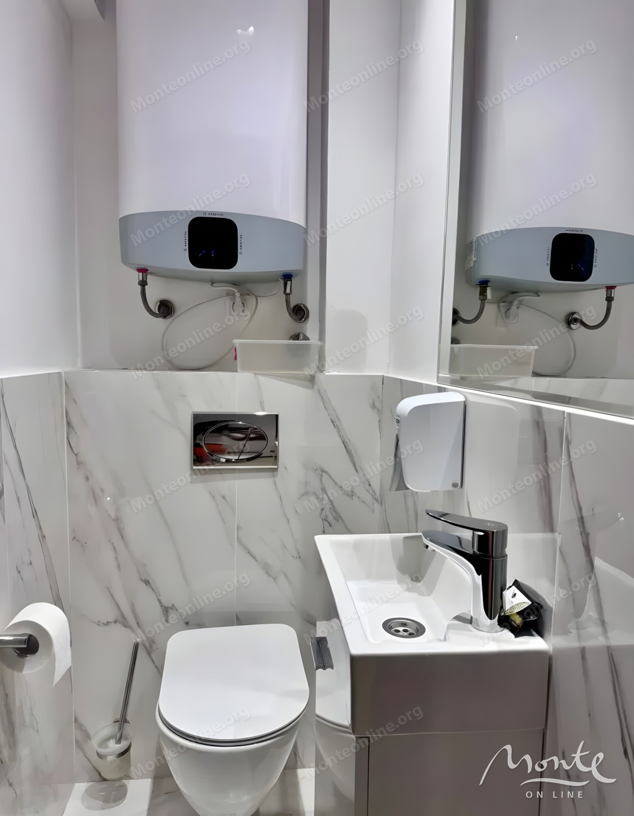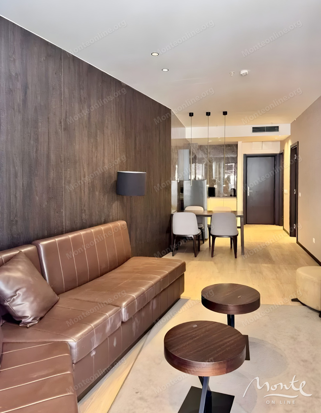 Квартира имеет функциональную и удобную планировку, включающую гостиную с кухонной зоной, одну уютную спальню, два санузла, что является редким форматом для такой площади.