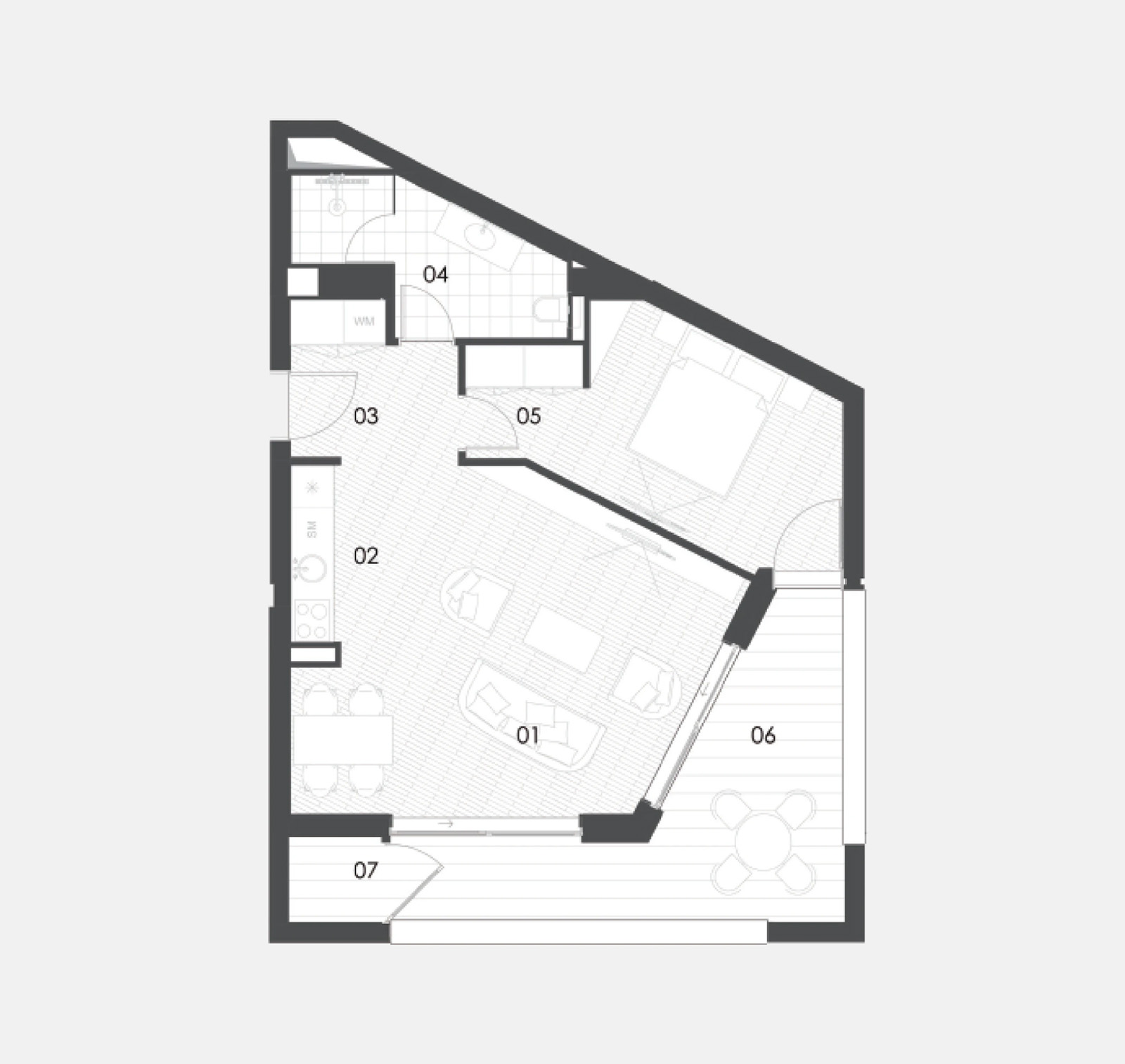 Планировка включает спальню, просторную гостиную с кухонной зоной, санузел и балкон. Продуманная геометрия пространства обеспечивает комфортное проживание и высокую арендную привлекательность.