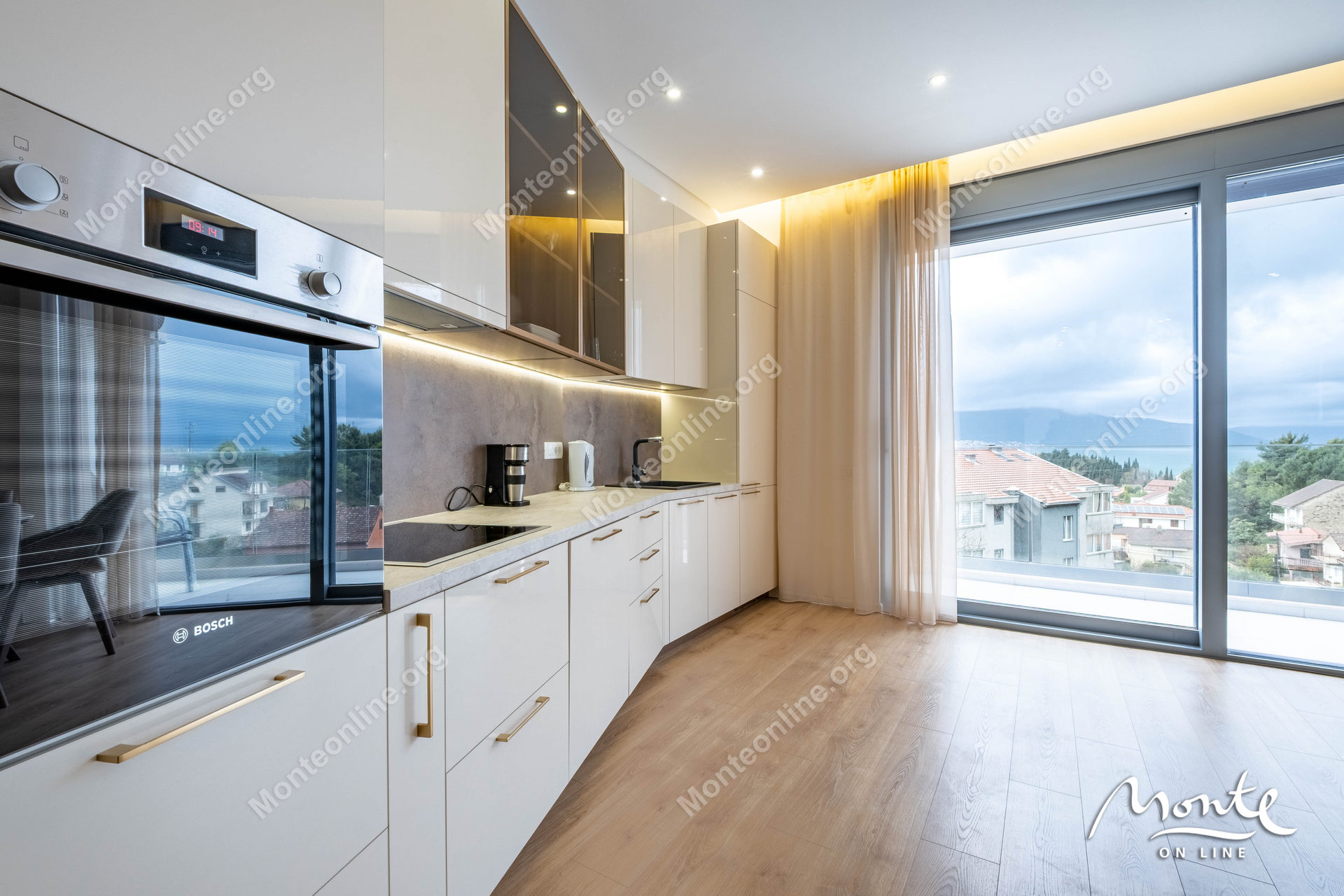 Просторная гостиная с кухней открытой планировки наполнена естественным светом благодаря панорамным окнам и выходу на частную террасу с открытым видом. Кухня оснащена техникой Bosch, имеет много мест для хранения и современное освещение.