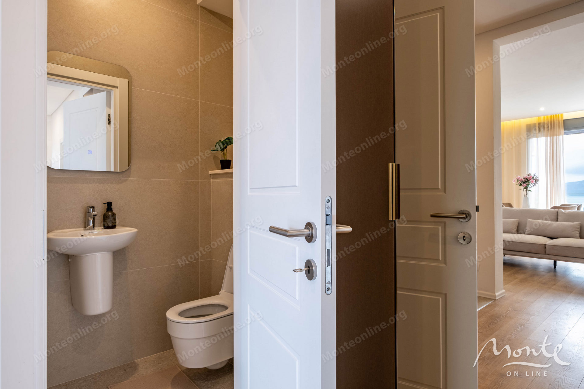 Планировка включает две комфортные спальни, одна из которых с выходом на террасу, современную ванную комнату с душевой кабиной и отдельный гостевой санузел. В прихожей — встроенный шкаф.