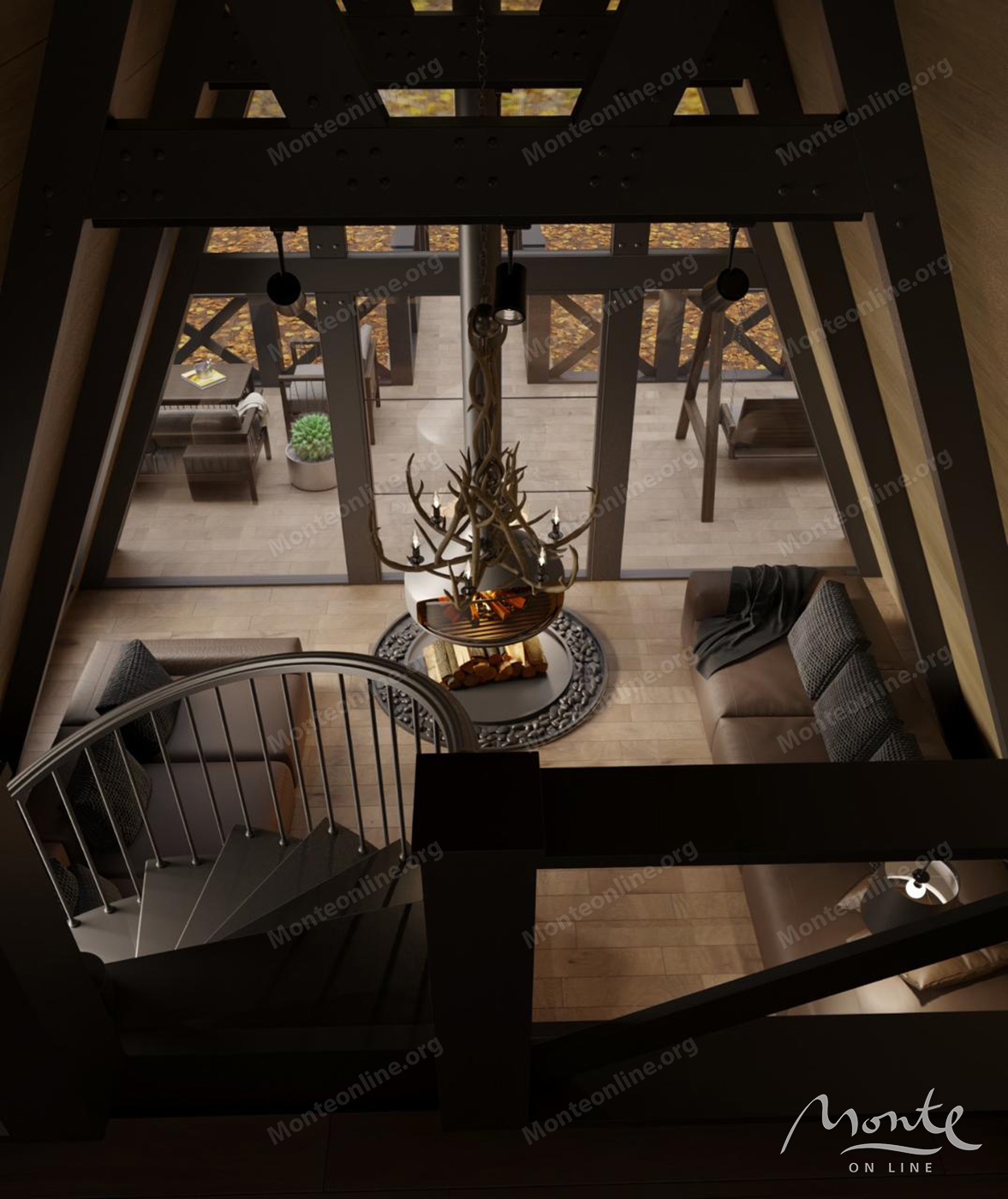 Интерьер выполнен в современном эко-стиле: натуральное дерево, мягкое освещение, дизайнерская мебель и камин создают неповторимую атмосферу загородного уюта. Высокие потолки и панорамные окна наполняют пространство светом, визуально расширяя его и объединяя интерьер с окружающим пейзажем.