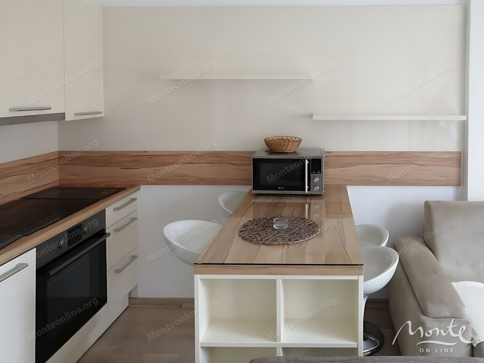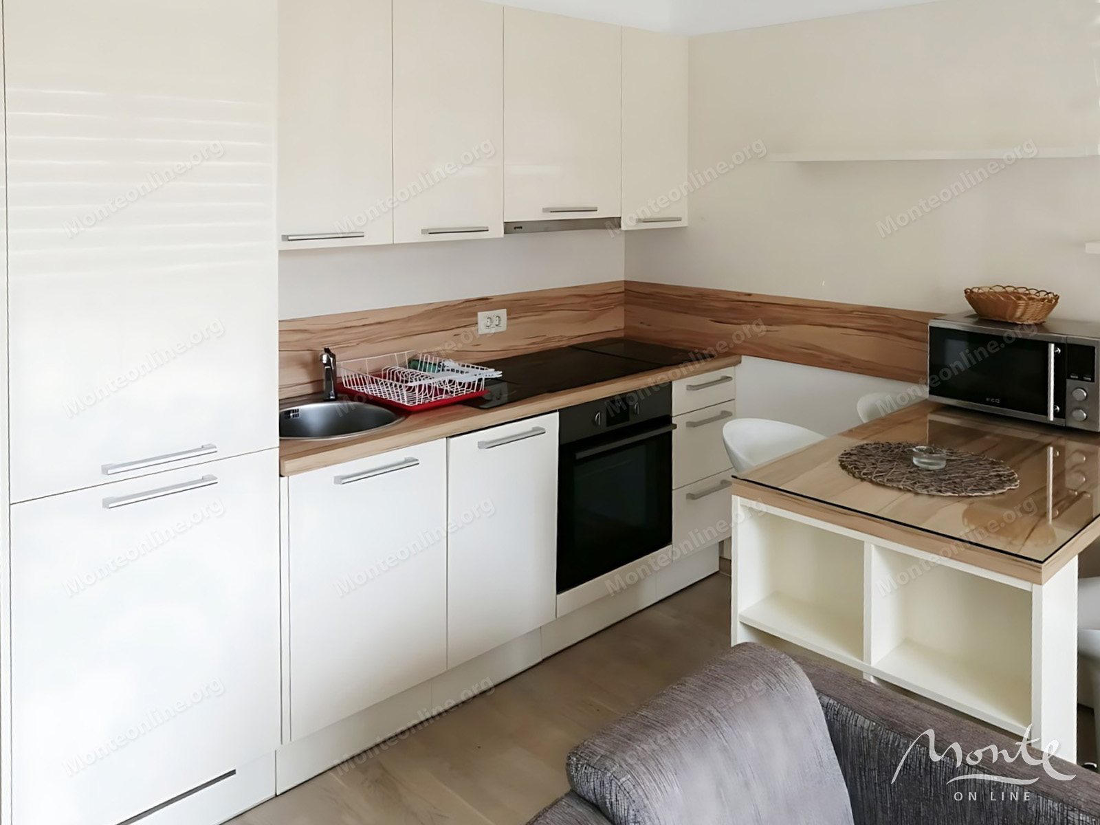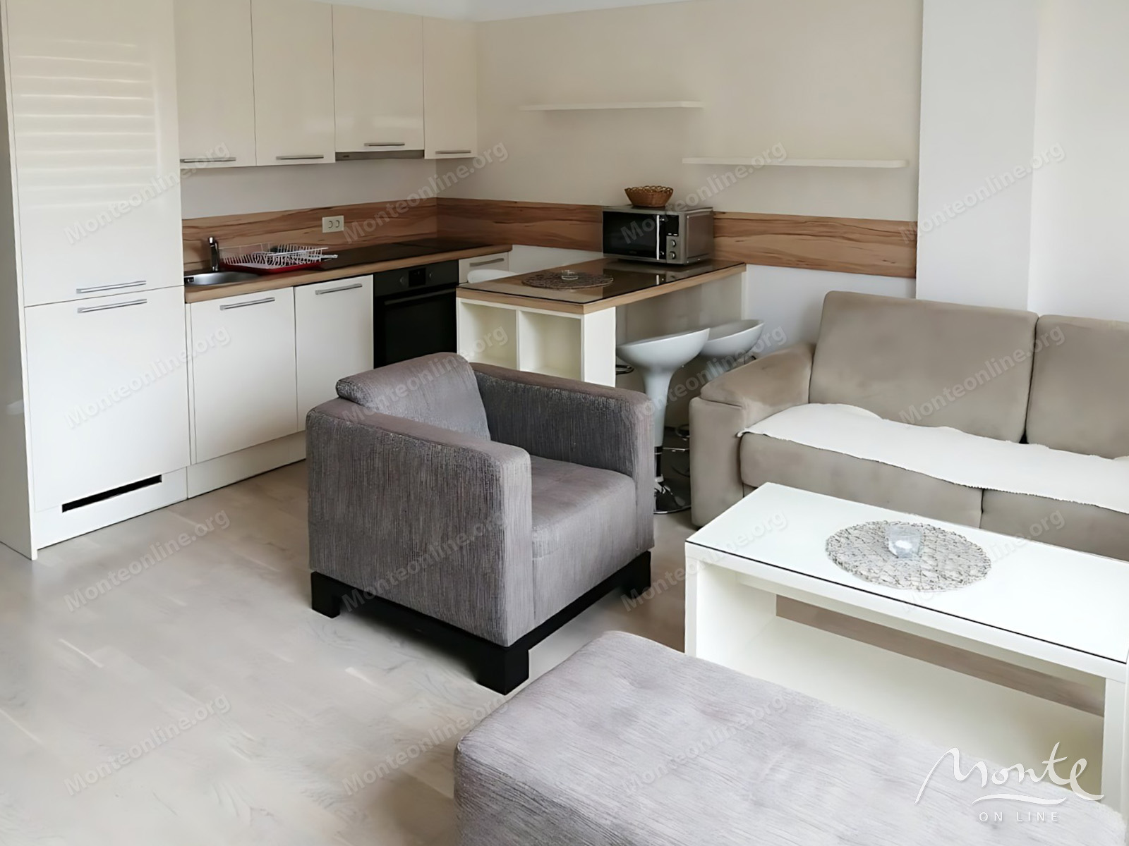 Квартира имеет функциональную планировку, включающую коридор, светлую гостиную со столовой зоной, кухню, одну спальню, ванную комнату и уютную террасу. Апартамент полностью оборудован мебелью и всей необходимой бытовой техникой, что позволяет новым владельцам сразу же заселиться или начать сдавать его в аренду.