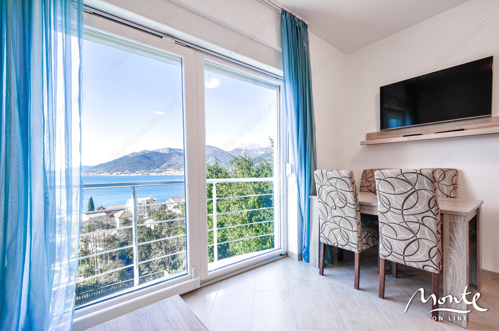 Apartman se nalazi na drugom (srednjem) spratu. Ovaj privatni, ugodan prostor je miran i nema susjeda u blizini. Zgrada - u zgradi - ima samo 6 apartmana. Neometan pogled na more i panoramski prozori omogućavaju vam da uživate u pogledu i čine apartman svijetlim. Voda je udaljena 200 metara. Plaža Waikiki (—) je udaljena 15 minuta hoda, marina Porto Montenegro (—) je udaljena 20 minuta hoda, a turistički centar i pristanište za izlete po Boki (- Kotorski zaliv) su udaljeni 5 minuta. U blizini se nalaze kafići, restorani, apoteke i trgovine.