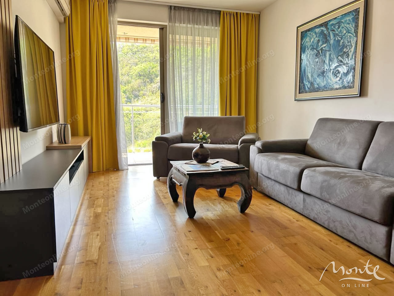 Prodaje se ugodan i moderan jednosoban stan na jednom od najljepših mjesta Budvanske rivijere — Pržno, samo nekoliko minuta od poznatih plaža Miločer i Sveti Stefan.